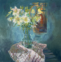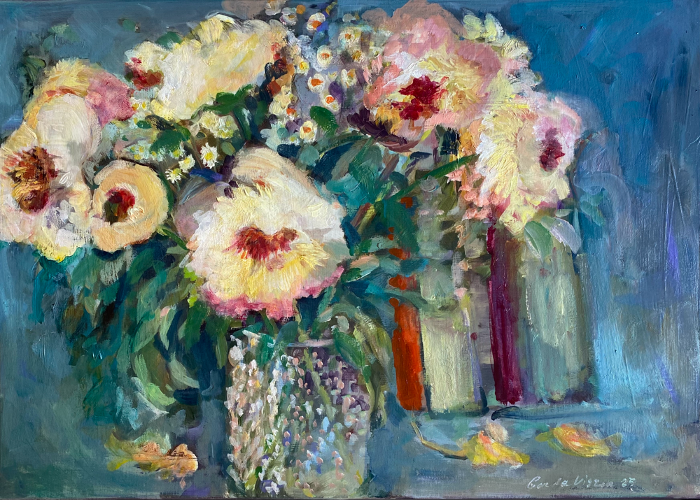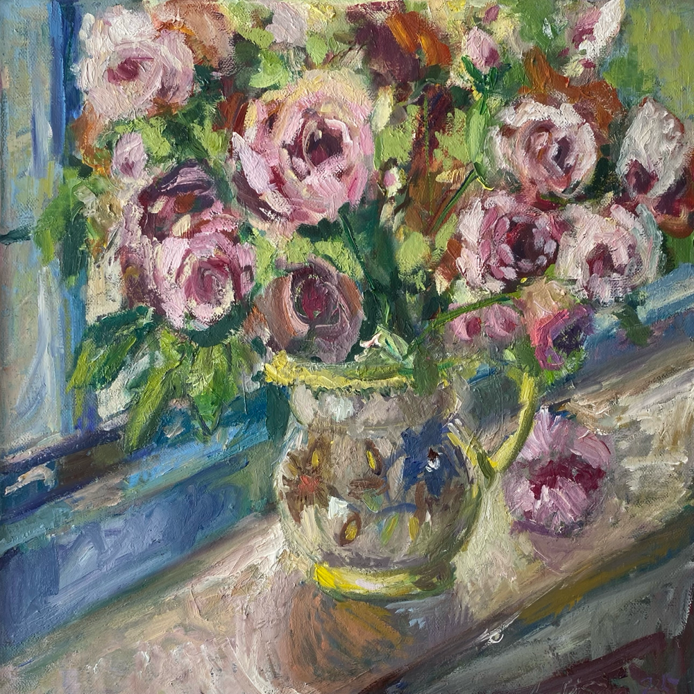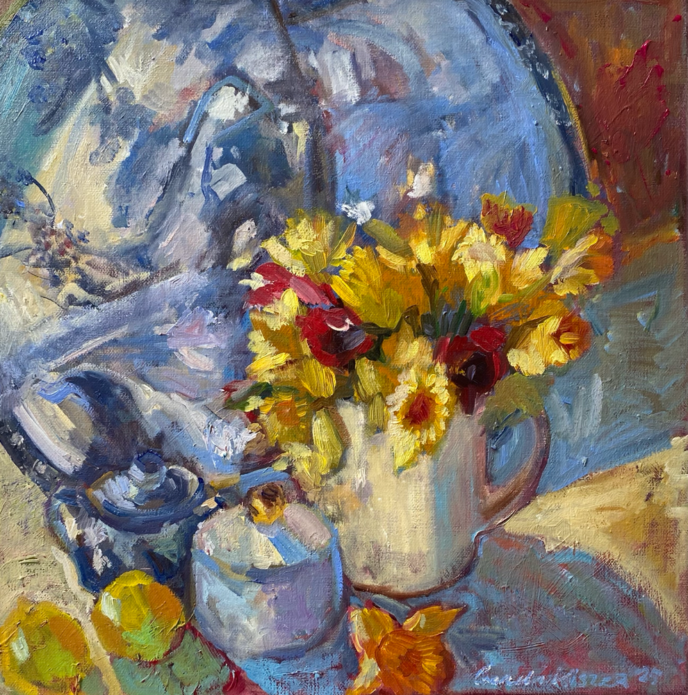 Mijn stillevens zijn rijk van compositie en vol van kleur, contrast en gelaagdheid. Bloemen in volle bloei of juist op het punt van van verwelken, een kopje, een vaas, stoffen, fruit, met zorg gekozen en met aandacht geschikt. deze schilderijen nodigen uit tot langer kijken en belonen je met details die pas later opvallen.